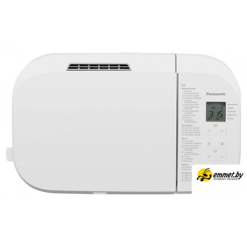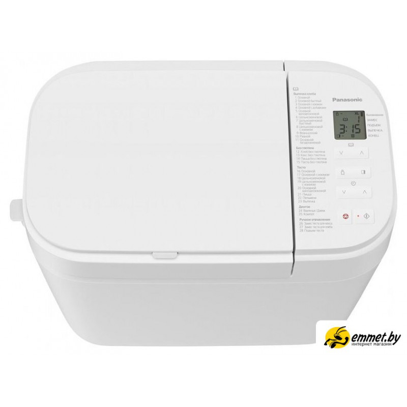 | Перечень режимов работы | Авто меню (Хлеб):1. Основной2. Основной быстрый3. Основной с изюмом4. Основной с добавками5. Основной малодрожжевой6. Цельнозерновой7. Цельнозерновой быстрый8. Цельнозерновой с изюмом9. Французский10. Ржаной11. Основной бездрожжевойАвто меню (Без глютена):12. Хлеб без глютена13. Кекс без глютена14. Пицца без глютена15. Паста без глютенаАвто меню (Тесто):16. Основной17. Основной с изюмом18. Цельнозерновой19. Цельнозерновой с изюмом20. Основной малодрожжевой21. Пицца22. ПельмениАвто меню (Другое):23. Выпечка24. Варенье/Джем25. Фрукты в сиропеАвто меню (Ручное управление):26. Замес теста для кекса27. Замес теста для хлеба28. Подъем теста |