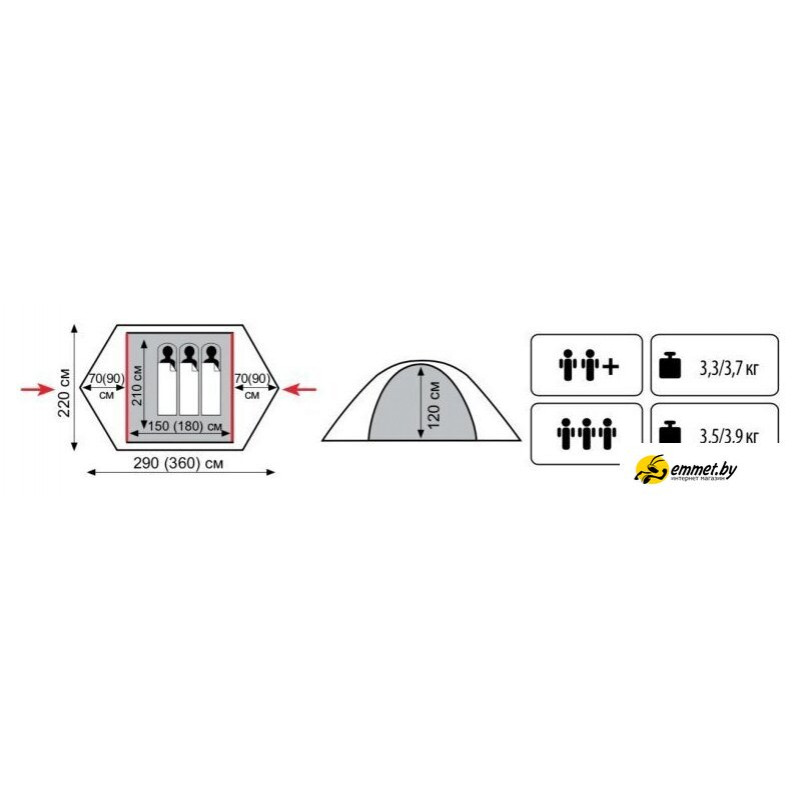 экспедиционная, зима/весна/лето/осень, 2-местная, 2 входа, 1 комната, противомоскитная сетка, тамбур, штормовые оттяжки, ДхШхВ: 290x220x120 см