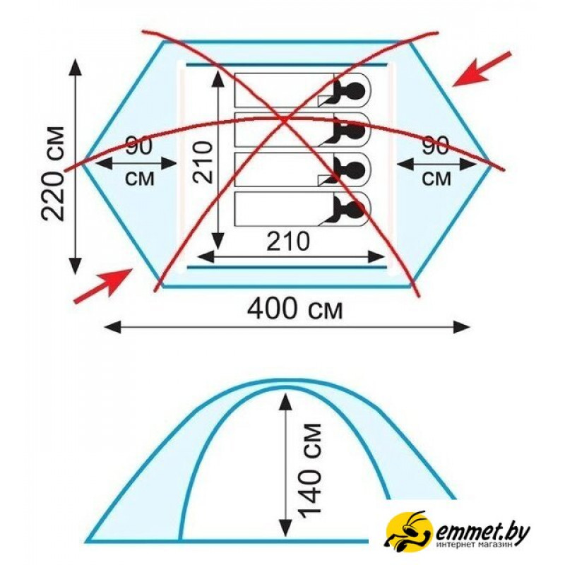 экспедиционная, зима/весна/лето/осень, 4-местная, 2 входа, 1 комната, противомоскитная сетка, тамбур, штормовые оттяжки, ДхШхВ: 400x220x140 см