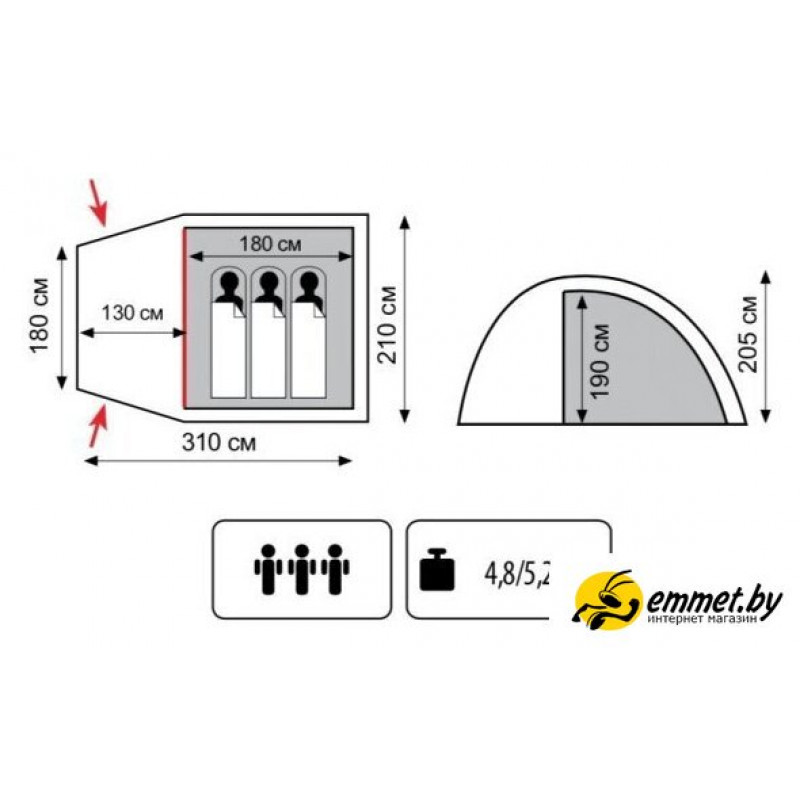 кемпинговая, весна/лето/осень, 3-местная, 2 входа, 1 комната, противомоскитная сетка, тамбур, штормовые оттяжки, ДхШхВ: 310x210x205 см