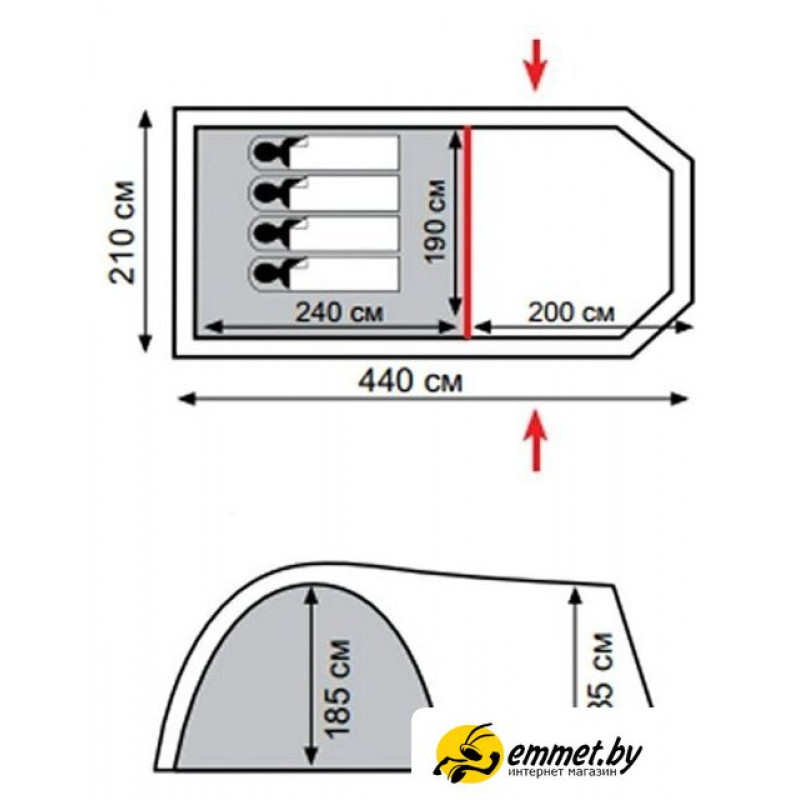 кемпинговая, весна/лето/осень, 4-местная, 2 входа, 1 комната, противомоскитная сетка, тамбур, штормовые оттяжки, ДхШхВ: 440x210x185 см
