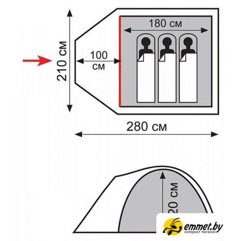 кемпинговая, весна/лето/осень, 3-местная, 1 вход, 1 комната, противомоскитная сетка, тамбур, штормовые оттяжки, ДхШхВ: 280x210x120 см