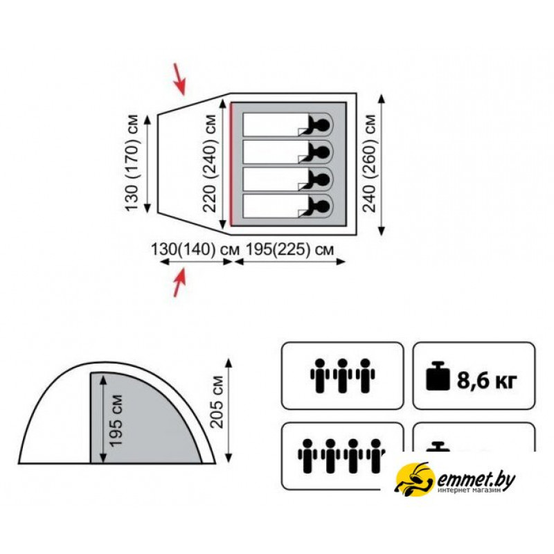 кемпинговая, зима/весна/лето/осень, 4-местная, 2 входа, 1 комната, противомоскитная сетка, тамбур, штормовые оттяжки, ДхШхВ: 365x260x205 см