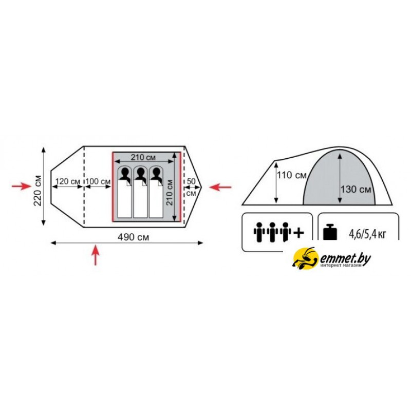 треккинговая, весна/лето/осень, 3-местная, 2 входа, 1 комната, противомоскитная сетка, тамбур, штормовые оттяжки