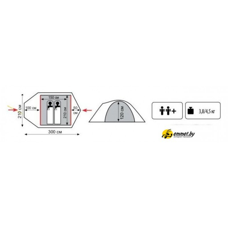 треккинговая, весна/лето/осень, 2-местная, 2 входа, 1 комната, противомоскитная сетка, тамбур, штормовые оттяжки, ДхШхВ: 300x210x120 см
