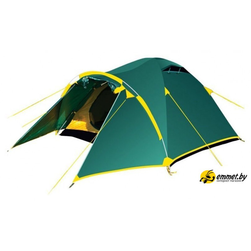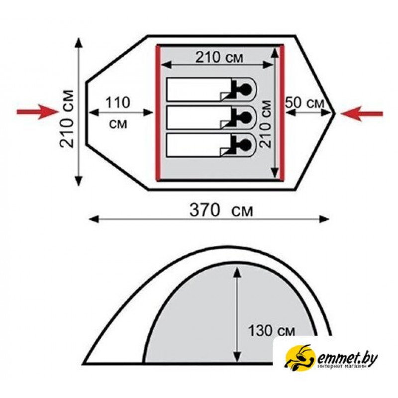 треккинговая, весна/лето/осень, 3-местная, 2 входа, 1 комната, противомоскитная сетка, тамбур, штормовые оттяжки, ДхШхВ: 370x210x130 см