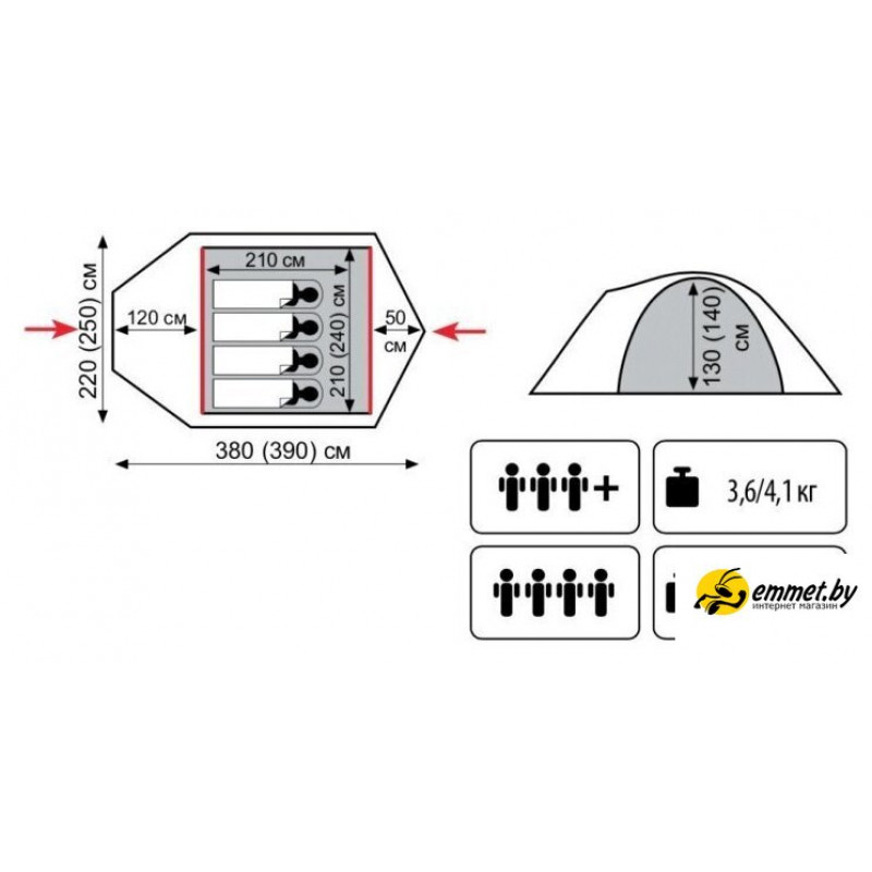треккинговая, весна/лето/осень, 4-местная, 2 входа, 1 комната, противомоскитная сетка, тамбур, штормовые оттяжки, ДхШхВ: 390x250x140 см