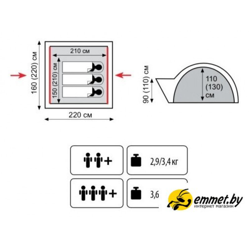 треккинговая, весна/лето/осень, 3-местная, 2 входа, 1 комната, противомоскитная сетка, тамбур, штормовые оттяжки