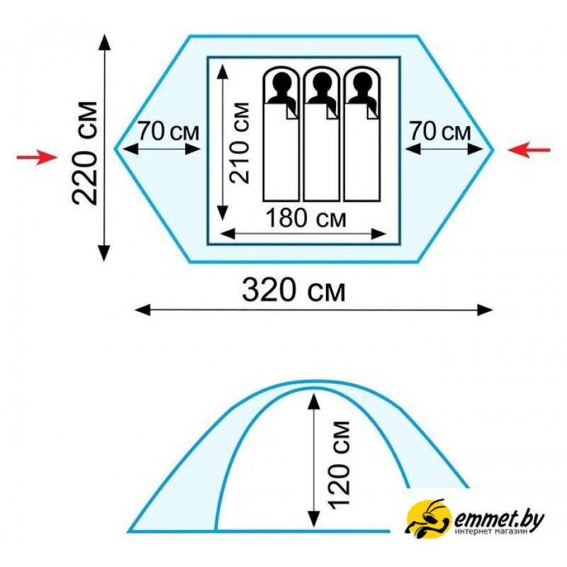 треккинговая, весна/лето/осень, 3-местная, 2 входа, 1 комната, противомоскитная сетка, тамбур, штормовые оттяжки, ДхШхВ: 320x220x120 см
