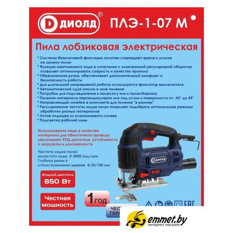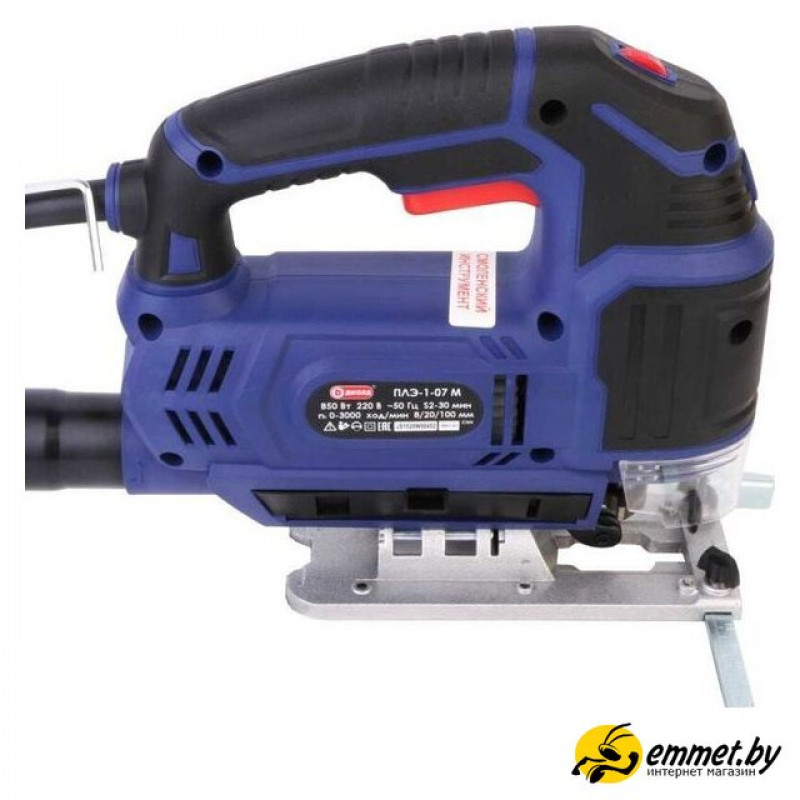 850 Вт, рукоятка-скоба, глубина пропила: 100 мм (дерево), 8 мм (сталь), 0–3000 ходов/мин, ход пилки: 18 мм, 2.1 кг