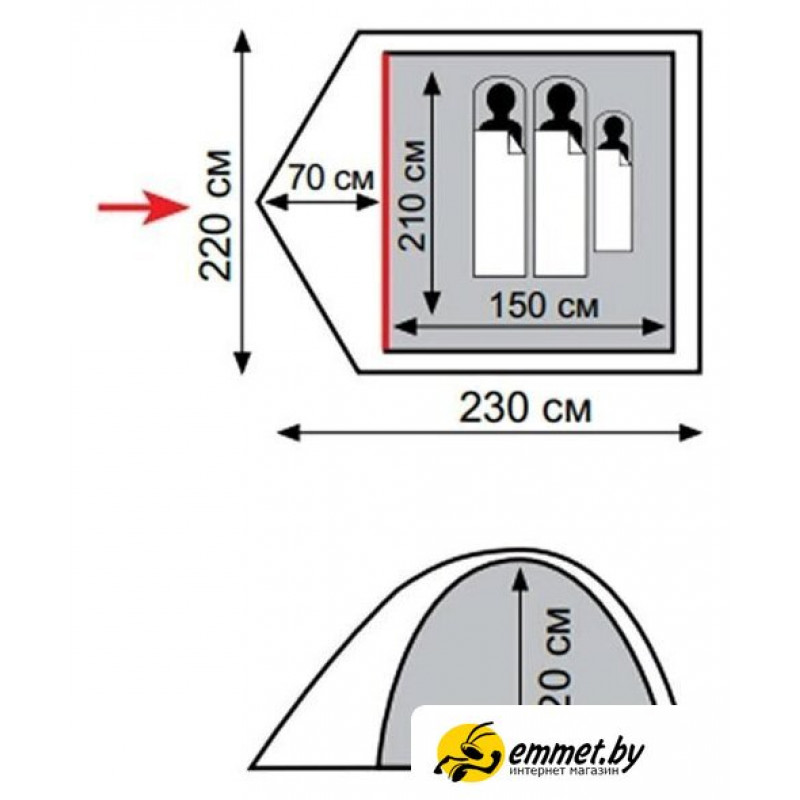 кемпинговая, весна/лето/осень, 3-местная, 1 вход, 1 комната, противомоскитная сетка, штормовые оттяжки, ДхШхВ: 230x220x120 см