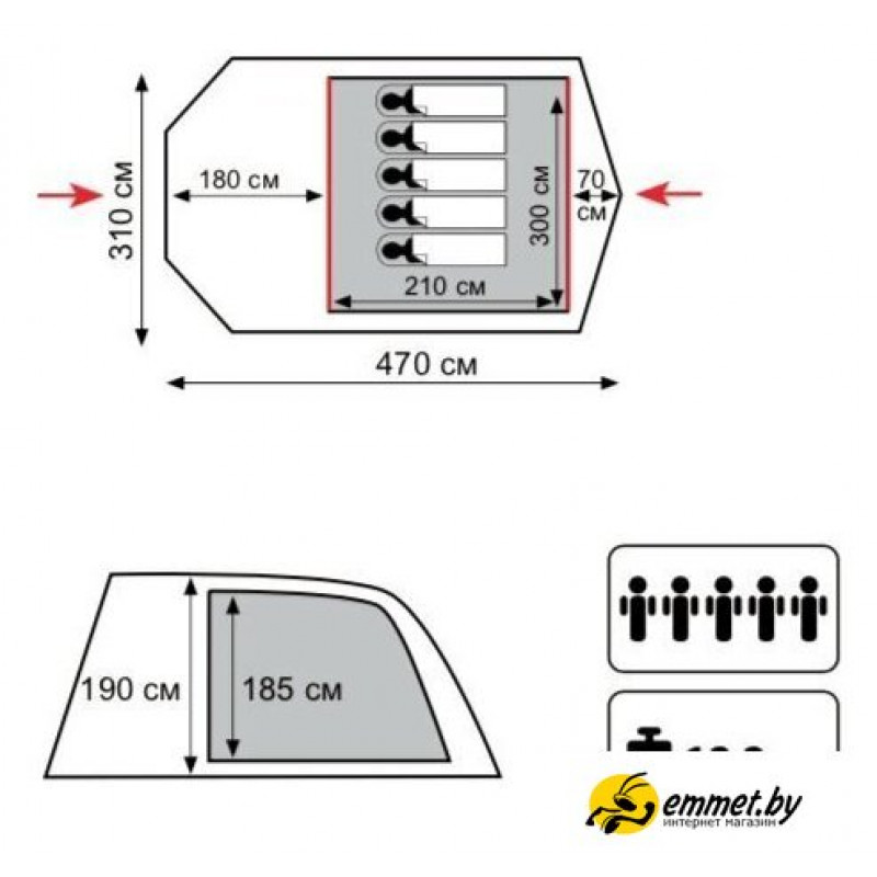 кемпинговая, зима/весна/лето/осень, 5-местная, 2 входа, 1 комната, противомоскитная сетка, тамбур, штормовые оттяжки, ДхШхВ: 470x310x190 см