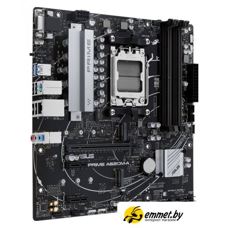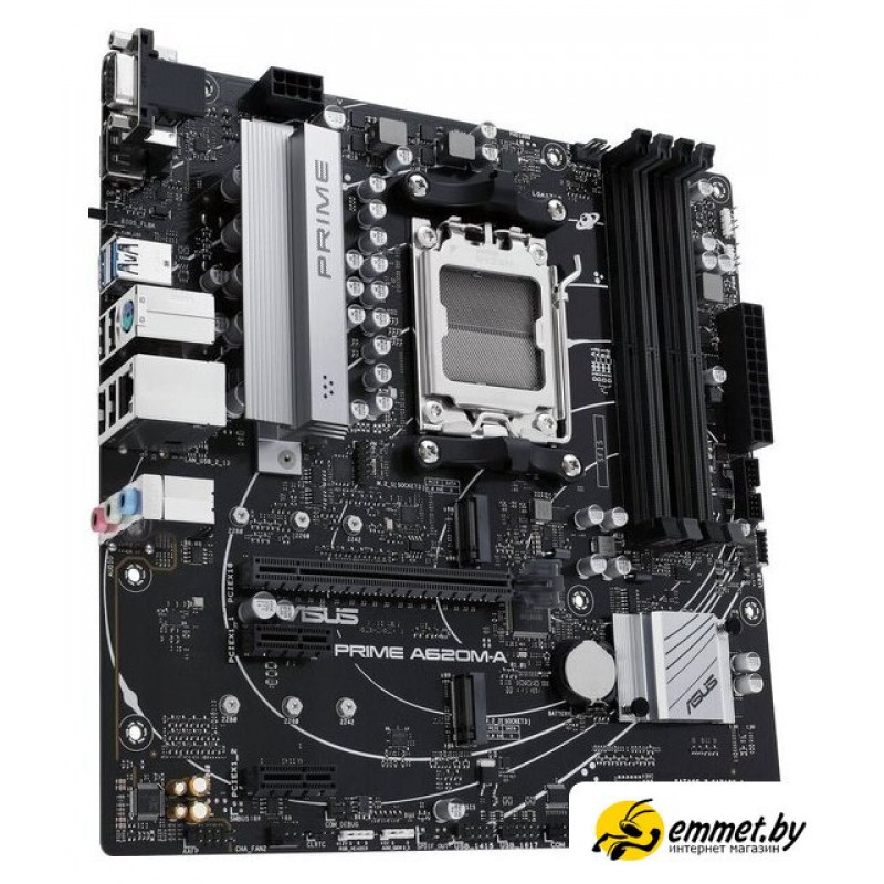 mATX, сокет AMD AM5, чипсет AMD A620, память 4xDDR5 до 7600 МГц, слоты: 1xPCIe x16 4.0, 2xPCIe x1, 2xM.2