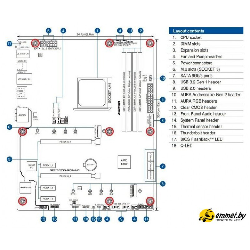 | Описание внутренних разъемов | 1 x CPU Fan connector(s)1 x CPU OPT Fan connector(s)3 x Chassis Fan connector(s)1 x AIO_PUMP connector1 x AAFP connector2 x Aura RGB Strip Header(s)1 x Addressable Gen 2 header(s)1 x USB 3.2 Gen 1(up to 5Gbps) connector(s) support(s) additional 2 USB 3.2 Gen 1 port(s)2 x USB 2.0 connector(s) support(s) additional 4 USB 2.0 port(s)1 x M.2 Socket 1 with M key, type 2242/2260/2280/22110 storage devices support(SATA & PCIe 4.0 x4 mode)1 x M.2 Socket 2 with M key, type 2242/2260/2280/22110 storage devices support (SATA & PCIE 3.0 x 4 mode)6 x SATA 6Gb/s connector(s)1 x Thunderbolt header(s)1 x 24-pin EATX Power connector(s)1 x 8-pin ATX 12V Power connector(s)1 x 4-pin ATX 12V Power connector(s)1 x System panel(s)1 x Thermal sensor connector(s)1 x Clear CMOS jumper(s) |