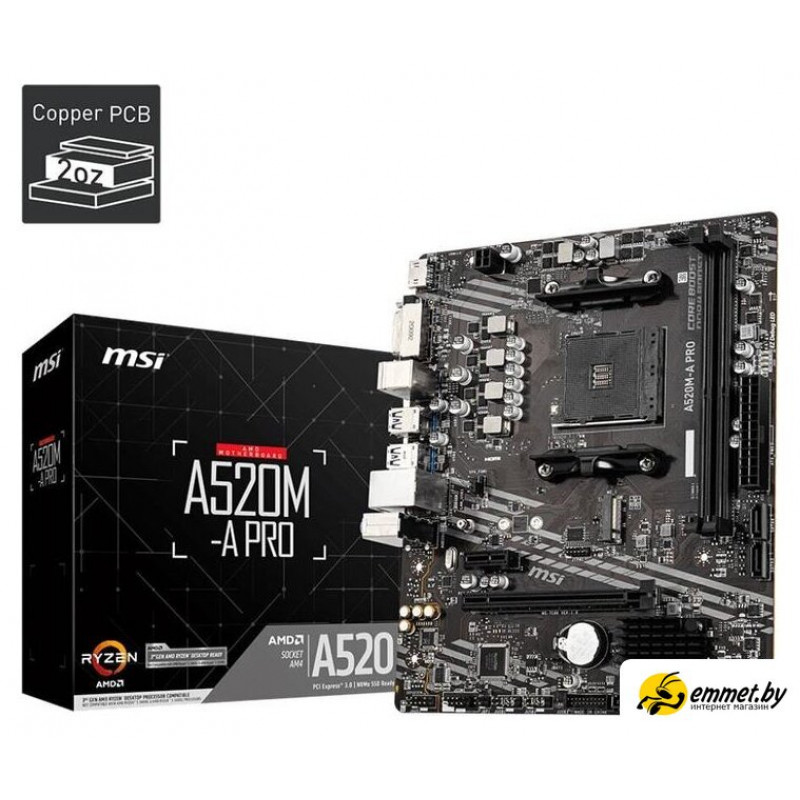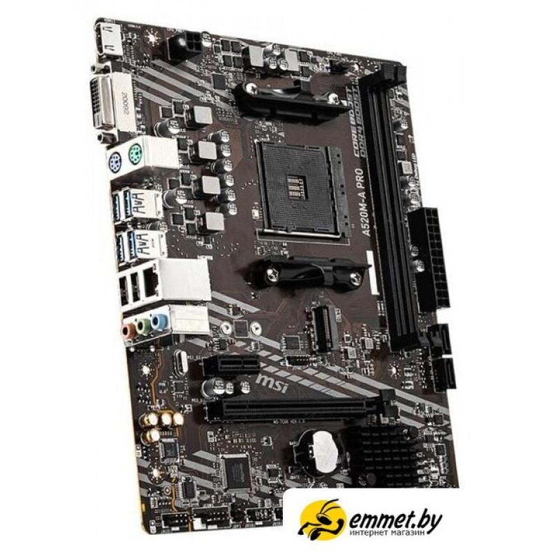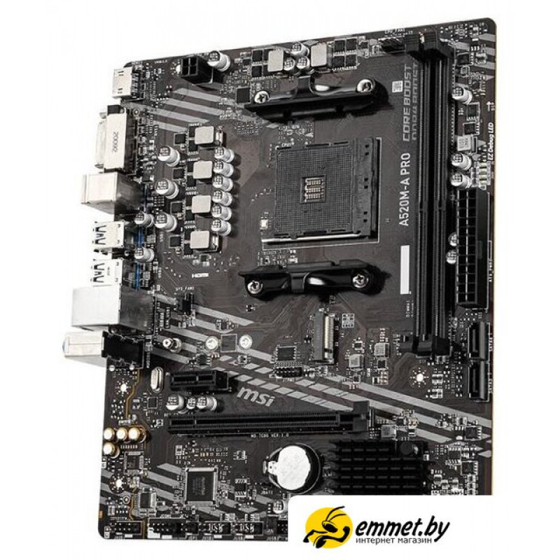 mATX, сокет AMD AM4, чипсет AMD A520, память 2xDDR4, слоты: 1xPCIe x16, 2xPCIe x1, 1xM.2