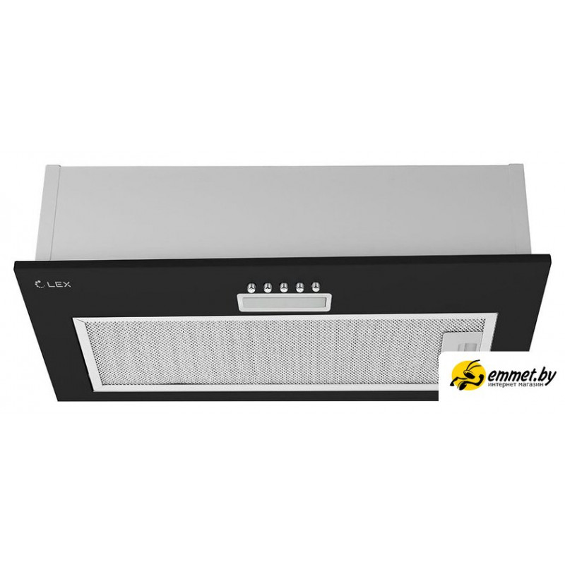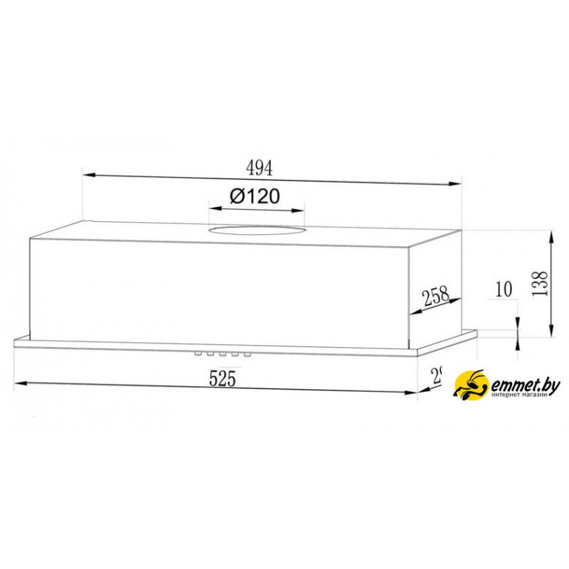 конструкция скрытая, монтаж для встраивания, ширина 52.5 см, управление механическое/кнопочное, производительность мотора 500 м³/ч, цвет черный