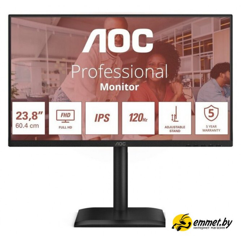 23.8", 1920x1080, 16:9, IPS, 120 Гц, глубина 6 бит + FRC, яркость 300 нит, динамики, HDMI+DisplayPort+D-Sub (VGA), регулировка высоты, портретный режим